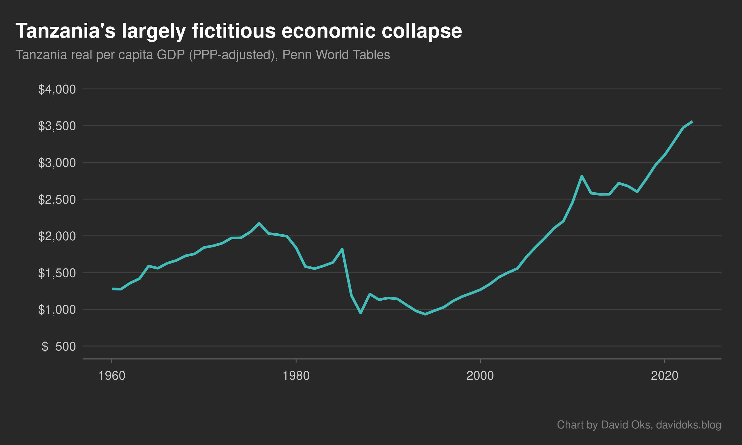 And the combination of terrible measurement with bad statistical practice means that we have no real understanding of the economic history of Africa. Take, for example, the apparent economic collapse that hit Tanzania in the 1980s.
