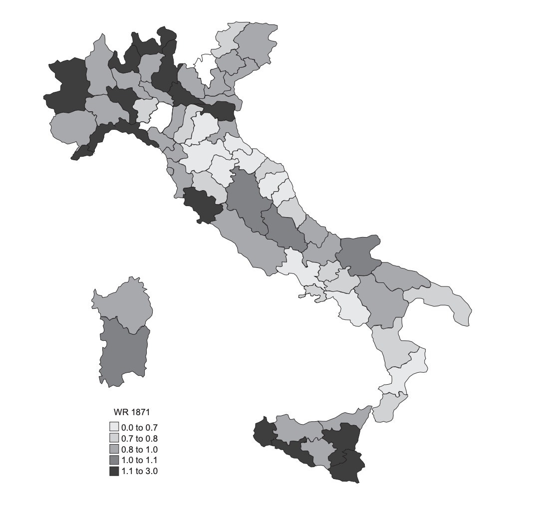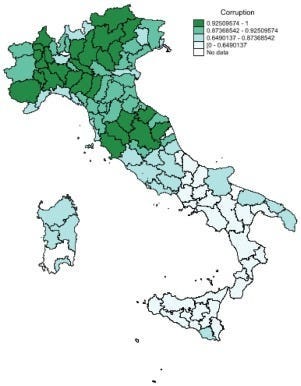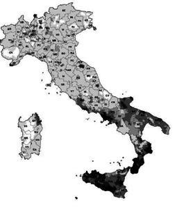 Out of these features of southern Italian society sprung many of the pathologies that plagued southern Italy throughout the nineteenth and twentieth centuries: the ubiquitous brigandism and banditry, the enduring strength of organized crime, the widespread sense of civic apathy, and the “praetorian” (to borrow Samuel Huntington’s term) nature of the southern Italian political sphere, where even into the 1990s violence against public officials was an ever-present fact of life. Even today we see the same basic malarial pattern imprinted on regional maps of Italy. For instance, the strength of the Mafia and Mafia-type groups: