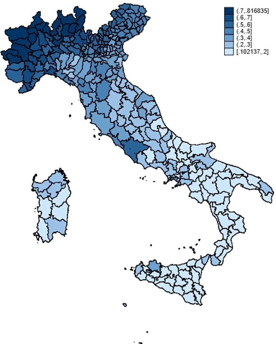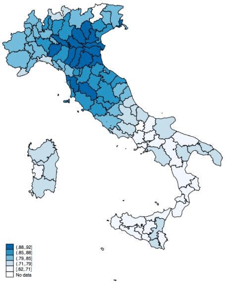 The third inheritance of the latifondi is the remarkably low level of human capital accumulation in southern Italy. As in other places characterized by the political and social dominance of extractive landowners, such as in Latin America, landed elites were generally antagonistic to mass education for the peasants, for the simple reason that there was no benefit to be gained from smarter farm laborers. Thus we see the same pattern of malaria and land inequality repeated in a map of literacy rates from 1929.