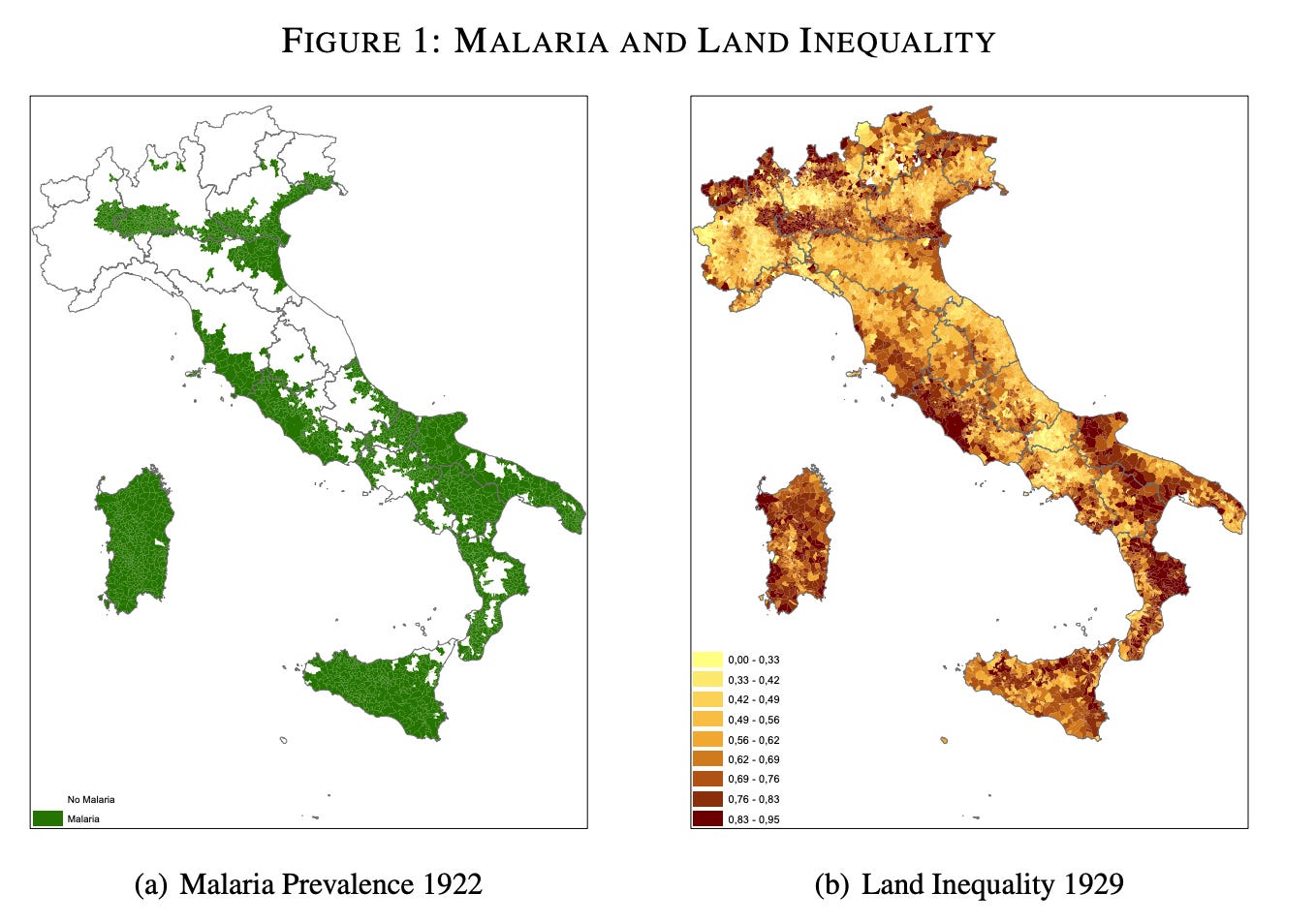 As that excerpt notes, this was not unique to western central or southern Italy. Wherever malaria has coexisted with pastoral agriculture—in the American South, the Caribbean islands, Brazil, in the Arabian peninsula—it has tended to select for large estates manned by slaves. Thus we see, in the case of Italy, that malaria prevalence was strongly correlated with land inequality.