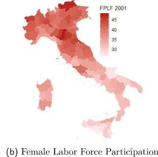 The second inheritance of the latifondi is the low status of women throughout southern Italian society. Whereas on northern Italian farms women might tend kitchen gardens or raise poultry, in the south they were generally excluded from agricultural work—which was, after all, much more dangerous than in the north—and confined to the management of domestic activities, such as weaving and bread-making. This division of labor informed the strongly patriarchal cultural norms characteristic of southern Italy, whose imprint one can still see in maps of female labor force participation in the 21st century.