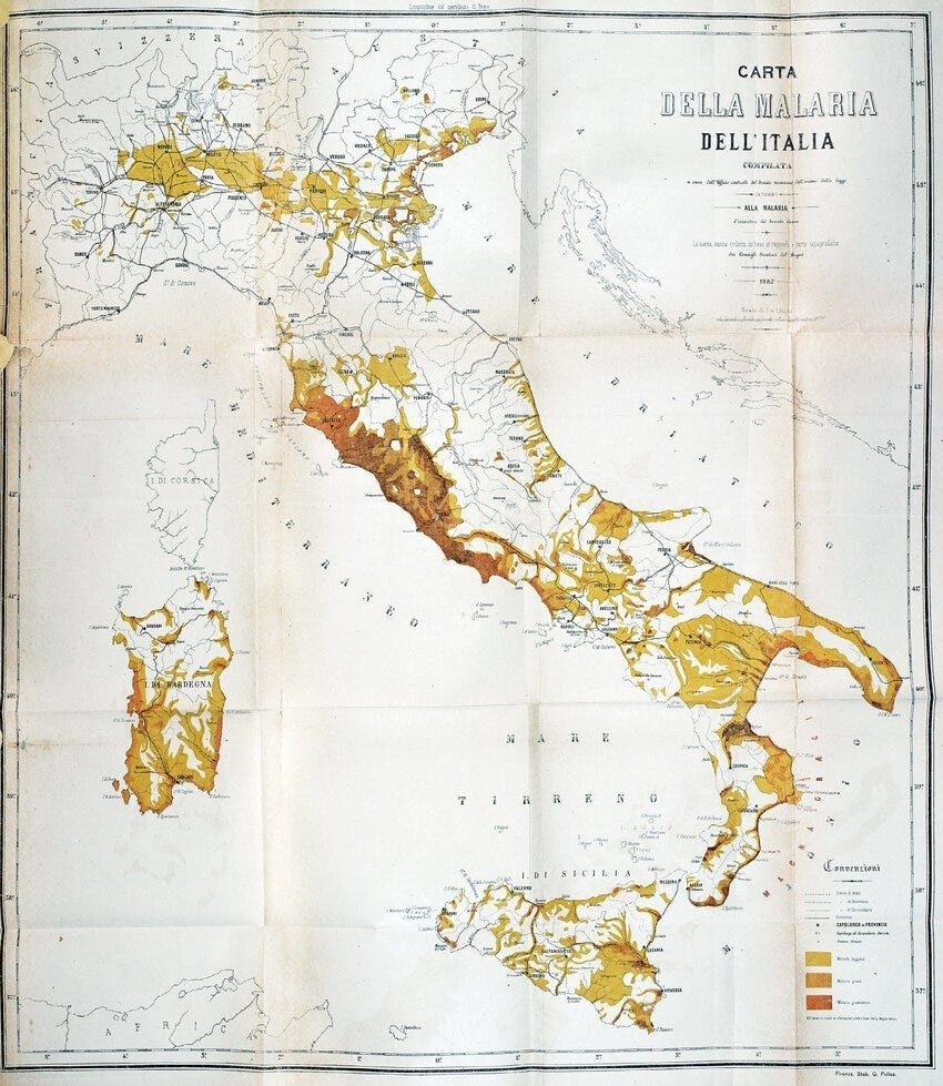 There are a few malarial areas in the north of Italy, though those places are generally cold enough that the strand of Plasmodium that could survive there is the relatively mild Plasmodium vivax, which is not so grave a threat to humans. In the central west of the Italian peninsula, by contrast, you have notoriously pestilential marshlands like the Pontine Marshes, which Julius Caesar had wanted drained before his assassination; there were various unsuccessful attempts in the 2,000 years that followed until Mussolini finally succeeded in draining them via massive mechanical pumps in the 1930s. Throughout the south, meanwhile, malaria was widespread due to river conditions: whereas in the north the Po River was fed by meltwater from the Cottian Alps, the Apennines that dominate the topography of the south aren’t tall enough for year-round snow; and so southern rivers are fed exclusively by the rain, and thus flood in the winter and dry up in the summer—in both seasons leaving behind endless puddles. It was, in short, an ideal environment for Plasmodium falciparum, the parasite that causes the deadliest form of malaria.