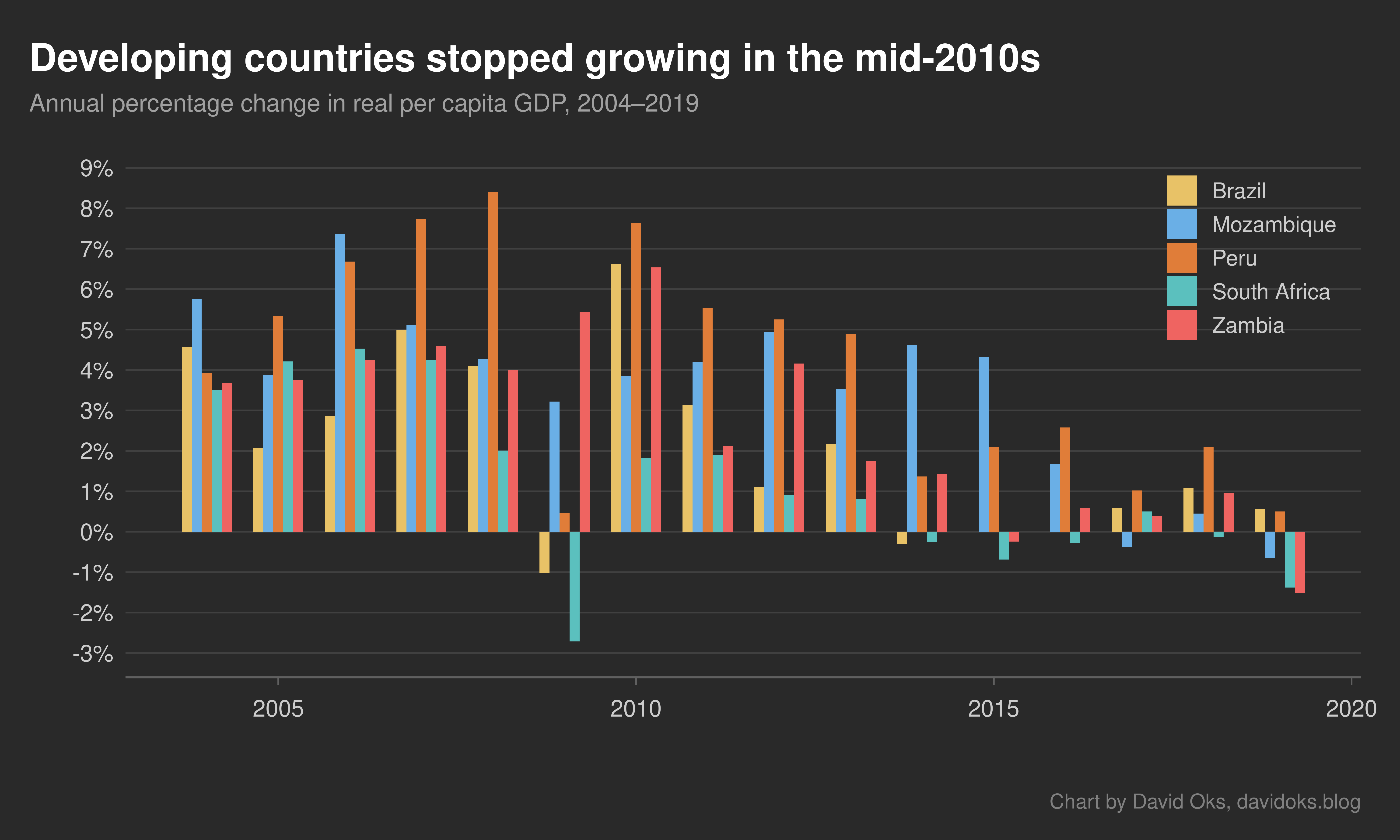 That’s exactly what happened in the mid-2010s. Chinese growth began to flag, and oil prices began to fall because American shale oil started entering global markets. And suddenly growth in poor countries collapsed. Mozambique’s per capita GDP grew at an average rate of 5.2 percent per year from 2004 to 2014; between 2014 and 2024 that fell to 0.3 percent. Zambia’s annualized growth fell from 3.5 percent to 0.3 percent. Peru fell from 4.5 percent to 1 percent. Brazil fell from 2.3 percent to 0.2 percent. South Africa fell from 2 percent to negative 0.75 percent.