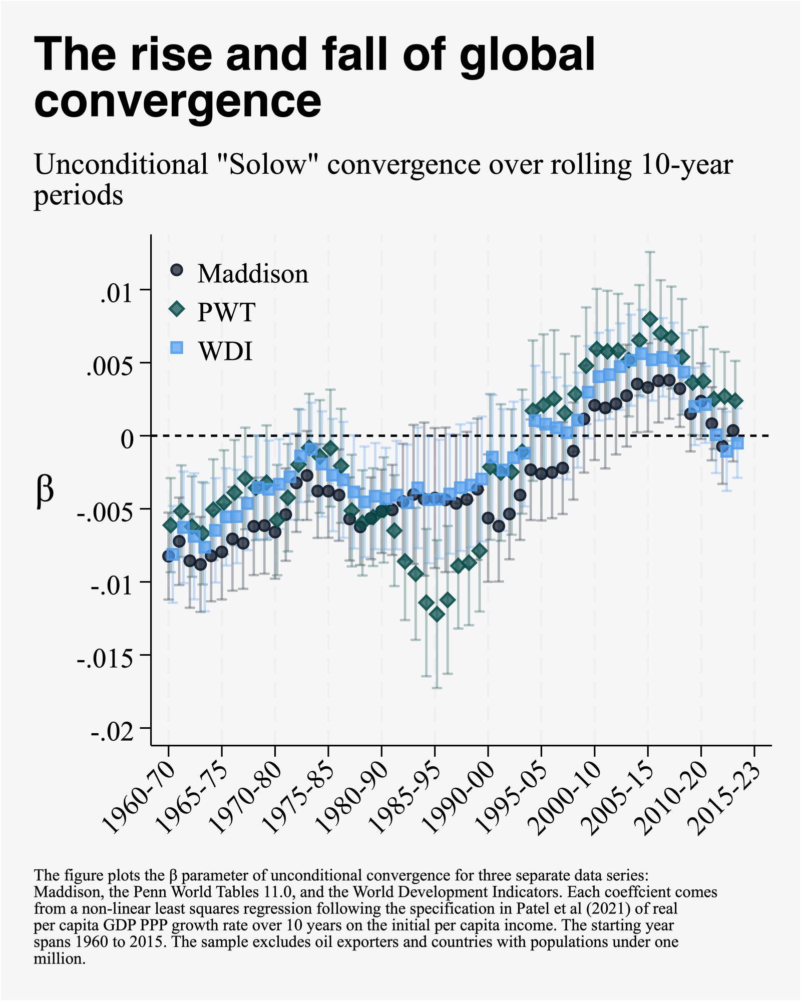 I think that SS&P miss the forest for the trees. The interesting question for me is not why convergence ended, but why it happened at all. We know that in all of modern economic history, there were roughly twenty years—the period between 1995 and 2015—when poor countries were reliably growing faster than rich ones. With the benefit of hindsight, perhaps we can call it “the Great Convergence.” It was great, despite being so short, because everything else was divergence.