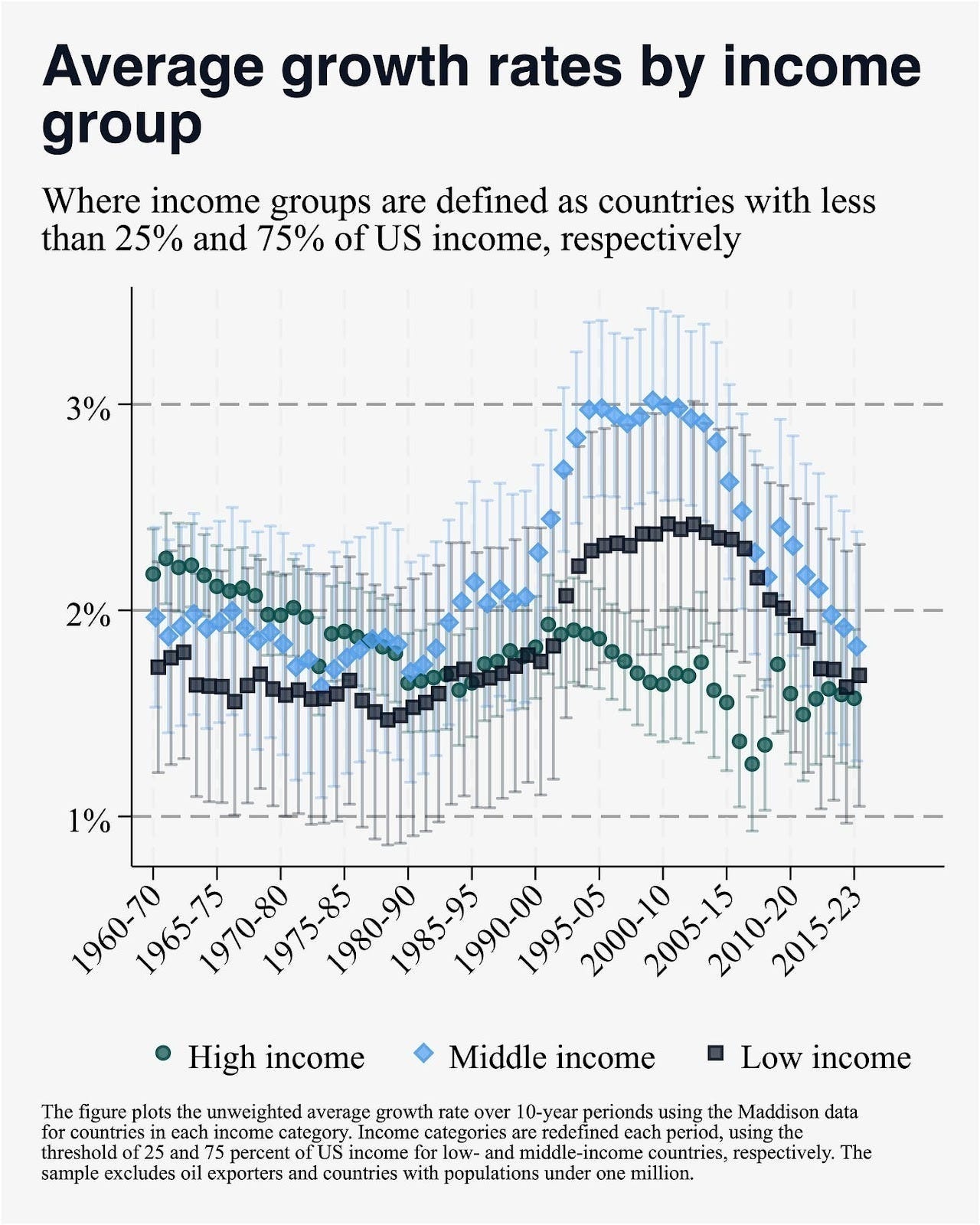 So what made that 1995–2015 period different? What happened between 1995 and 2015 that was so global and so important? And why did growth in poor countries collapse so rapidly in the middle years of the 2010s?